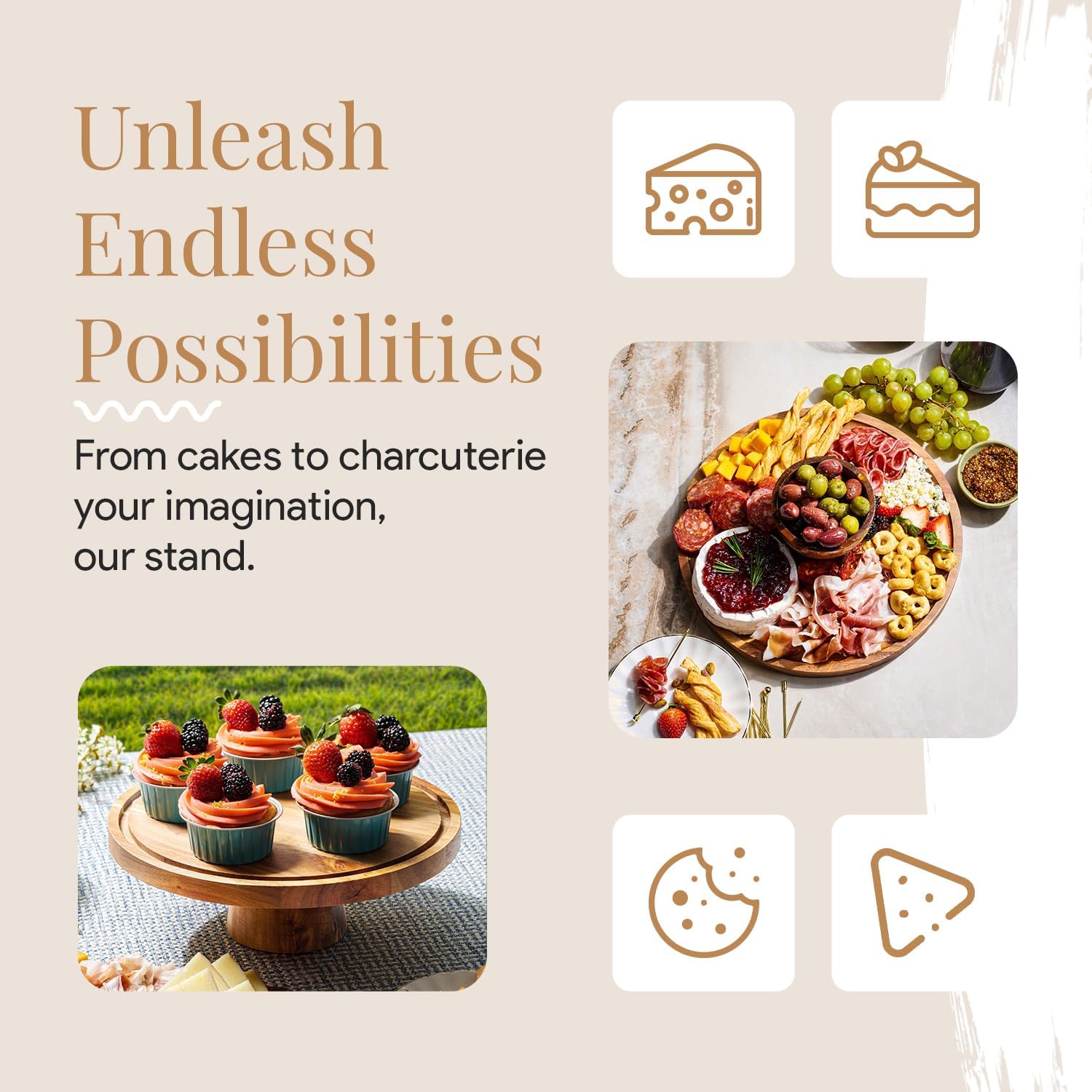 • Party Platter Perfection: Perfect for any occasion, this wooden cake stand doubles as a charcuterie board for Thanksgiving hosting must haves, also serving as an appetizer display for chips, dips, and popcorn. Flip it for a versatile fruit platter